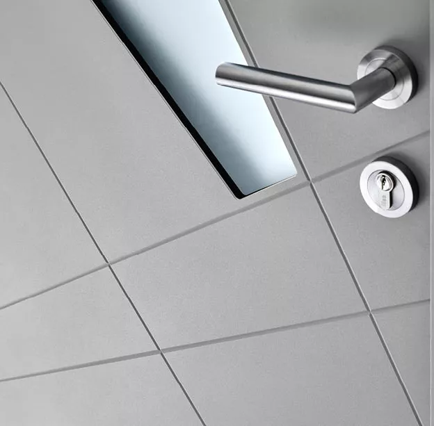 À l’extérieur, un motif décoratif usiné apporte du rythme, tandis qu’à l’intérieur, la simplicité s’impose. Le vitrage oblique traverse la porte, révélant un jeu de lumière unique