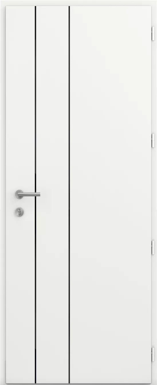 Un jeu de lignes obliques, créant un design contemporain et plein d’énergie pour votre porte. À l’intérieur, personnalisez votre porte avec des joncs en aluminium brossé ou en finition noire, selon votre style.