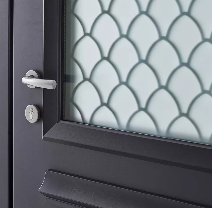 La porte d'entrée Carrousel se distingue par son vitrage orné d’un motif en écailles, rappelant les ferronneries anciennes. Son style traditionnel et son panneau de 85 mm d’épaisseur en aluminium assurent charme, robustesse et isolation pour sublimer les façades classiques.