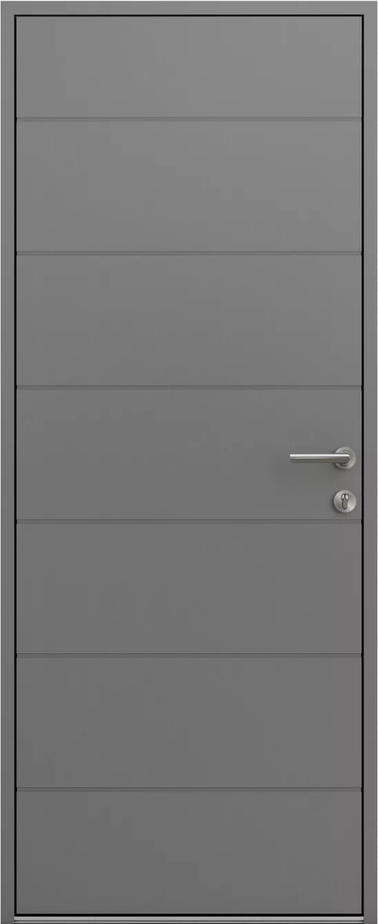 À l’extérieur, cette porte moderne séduit par son motif décoratif usiné en 6 lignes horizontales, alliant simplicité et élégance pour un style épuré et contemporain.