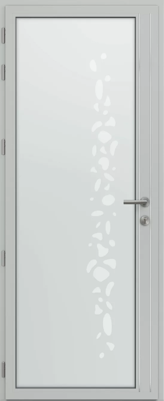 Motif sablé sur vitrage dépoli à l'éxtérieur. À l’intérieur, deux joncs en alu poli brillant soulignent les montants avec modernité.