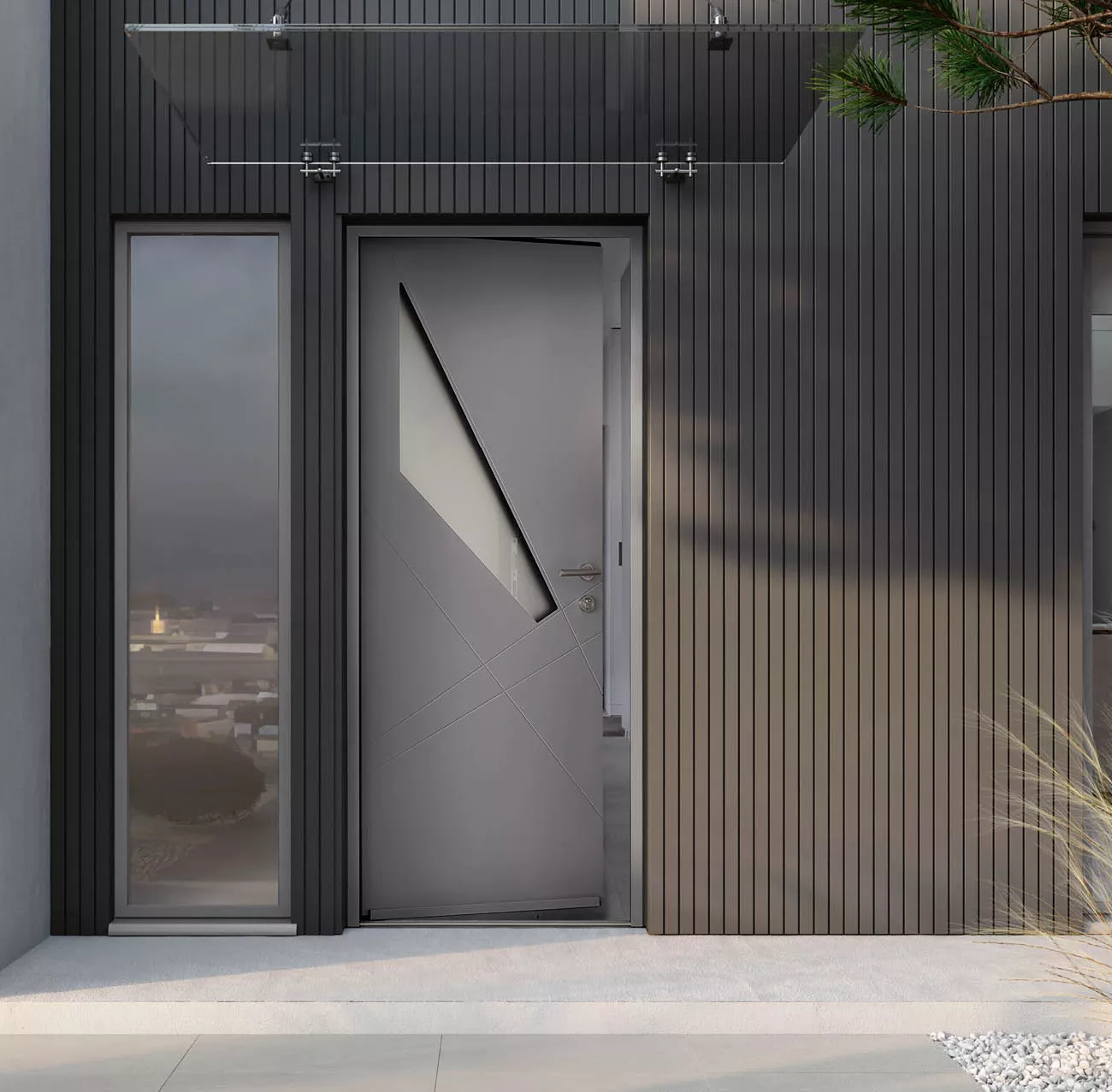 À l’extérieur, un motif décoratif usiné apporte du rythme, tandis qu’à l’intérieur, la simplicité s’impose. Le vitrage oblique traverse la porte, révélant un jeu de lumière unique