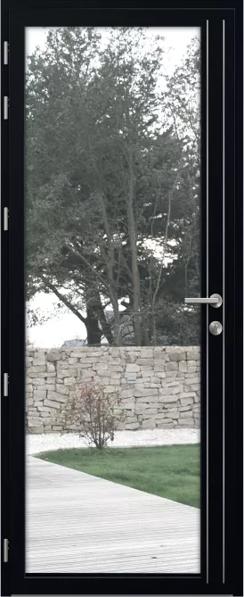Côté extérieur, un vitrage clair qui révèle la lumière pour une entrée éclatante. À l’intérieur, deux joncs en aluminium poli brillant habillent le montant, apportant modernité et raffinement à cette porte vitrée.