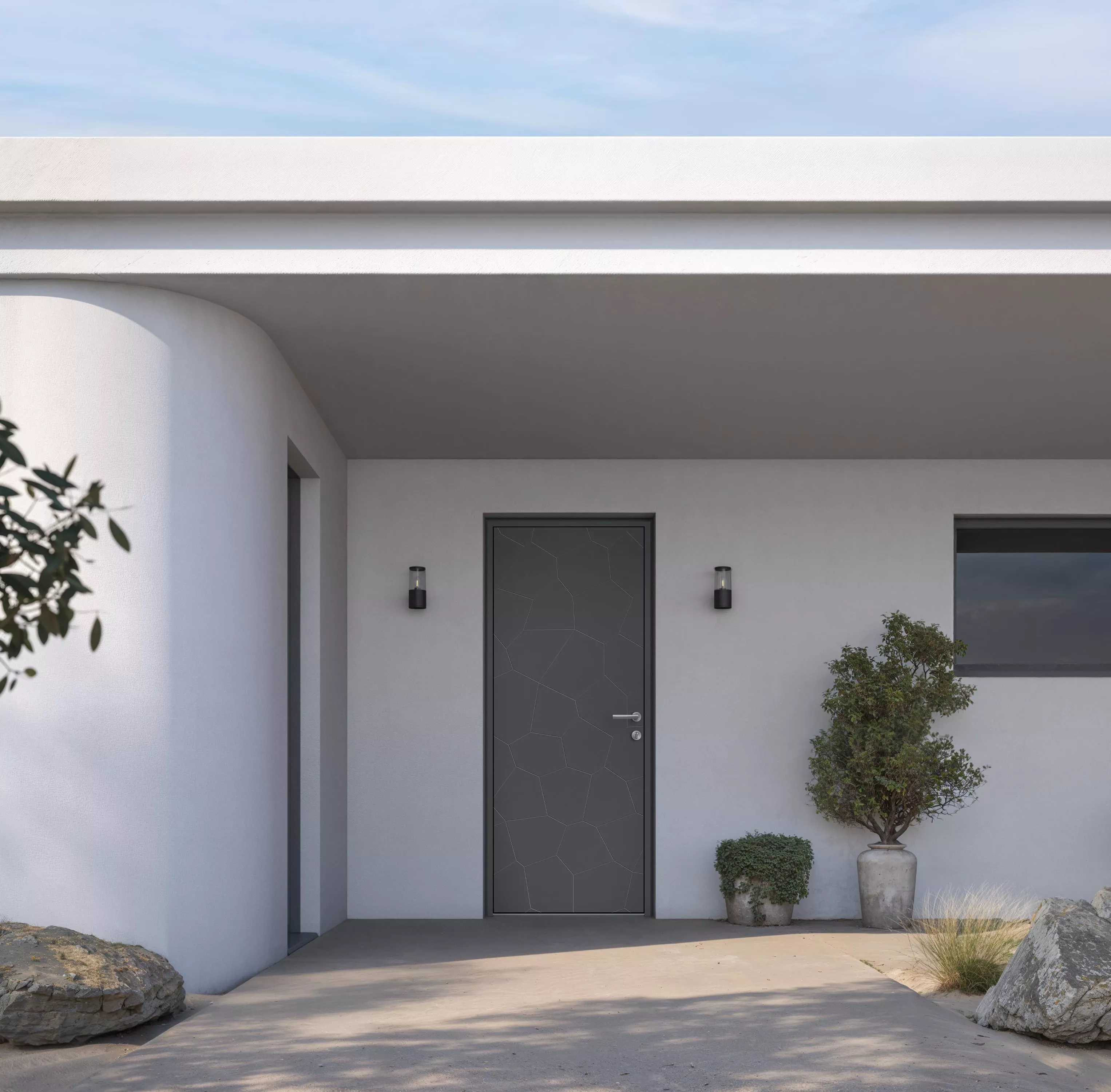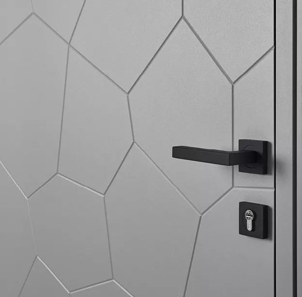 La porte d’entrée pleine Lapillis offre un motif géométrique unique évoquant des pierres naturelles. Sa finition grège texturée et son design moderne apportent caractère et originalité à votre façade. Épaisseur 85 mm. Modèle de la gamme Caractère.