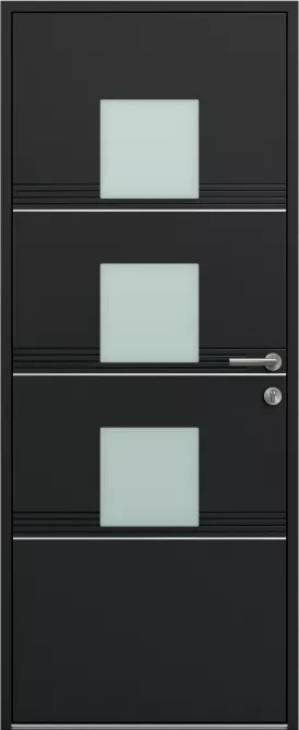 La porte d’entrée Ourali de la gamme Caractère affirme son style avec trois vitrages carrés parfaitement alignés, soulignés par des inserts aluminium horizontaux. Semi-vitrée, elle laisse entrer la lumière tout en conservant une excellente isolation grâce à son panneau de 85 mm d’épaisseur. Une porte résolument moderne, à la fois graphique et fonctionnelle.