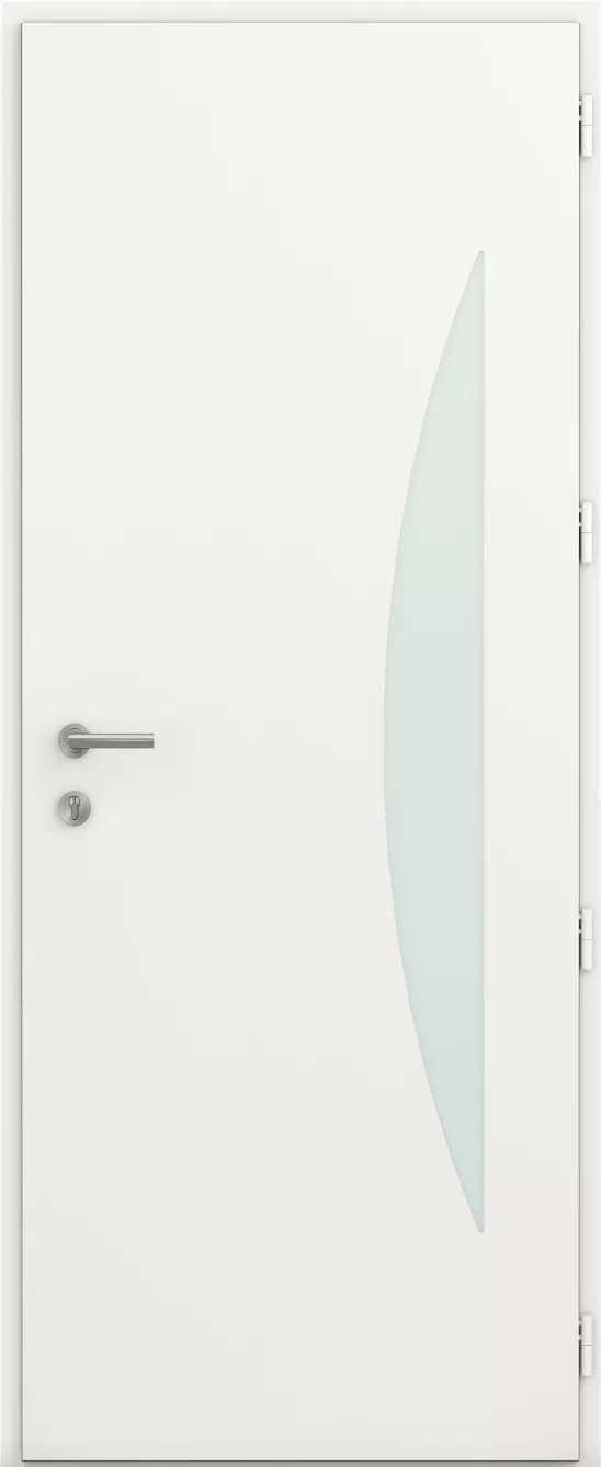 À l’extérieur, des joncs en aluminium brossé poli brillant captent la lumière avec intensité. À l’intérieur, une surface pure, sans motif ni usinage, pour une ambiance sereine et apaisante. Une porte semi-vitrée qui invite à l’harmonie.