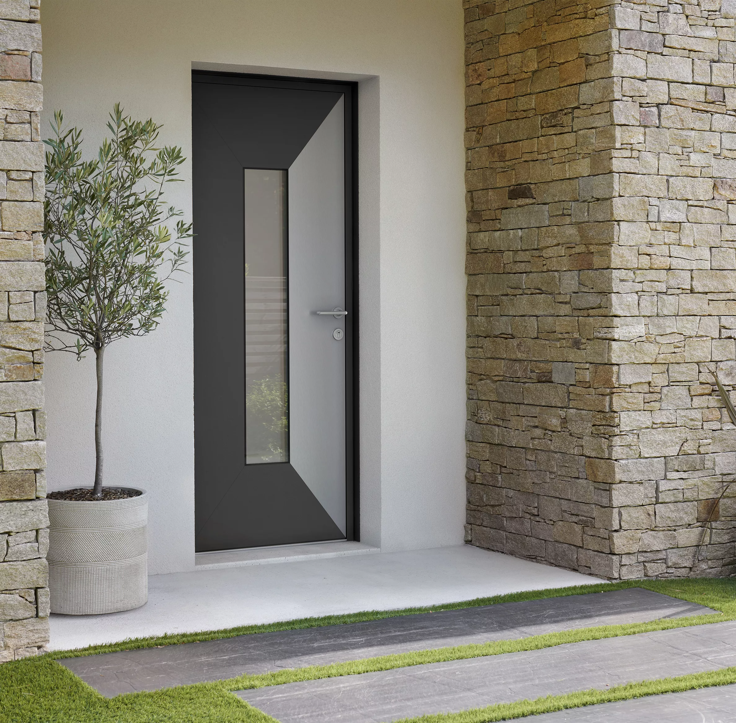 La porte d’entrée Scintilla séduit par son design moderne et géométrique. Semi-vitrée, en aluminium, avec insert en aluminium brossé, elle fait partie de la gamme Surface. Son épaisseur de 85 mm garantit isolation, sécurité et style audacieux.