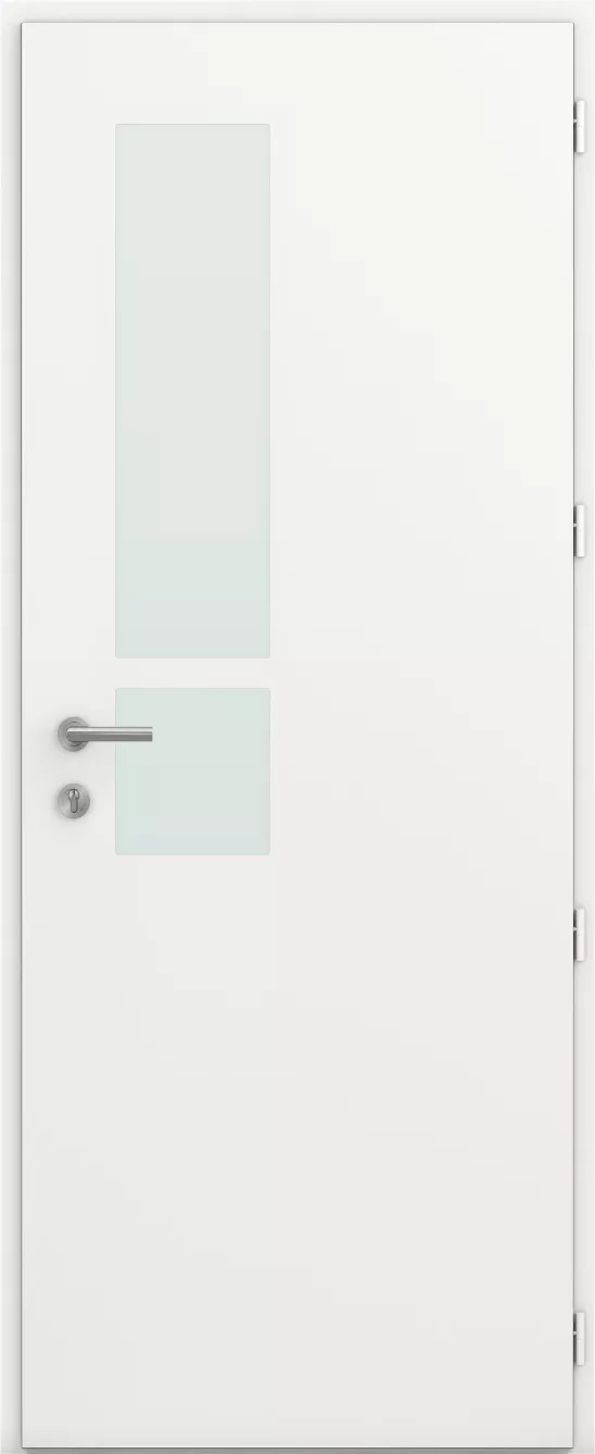 À l’extérieur, un motif décoratif usiné rythme la surface, tandis qu’à l’intérieur, la simplicité s’impose. Deux vitrages, carré et rectangulaire, apportent lumière et caractère à cette porte semi-vitrée.