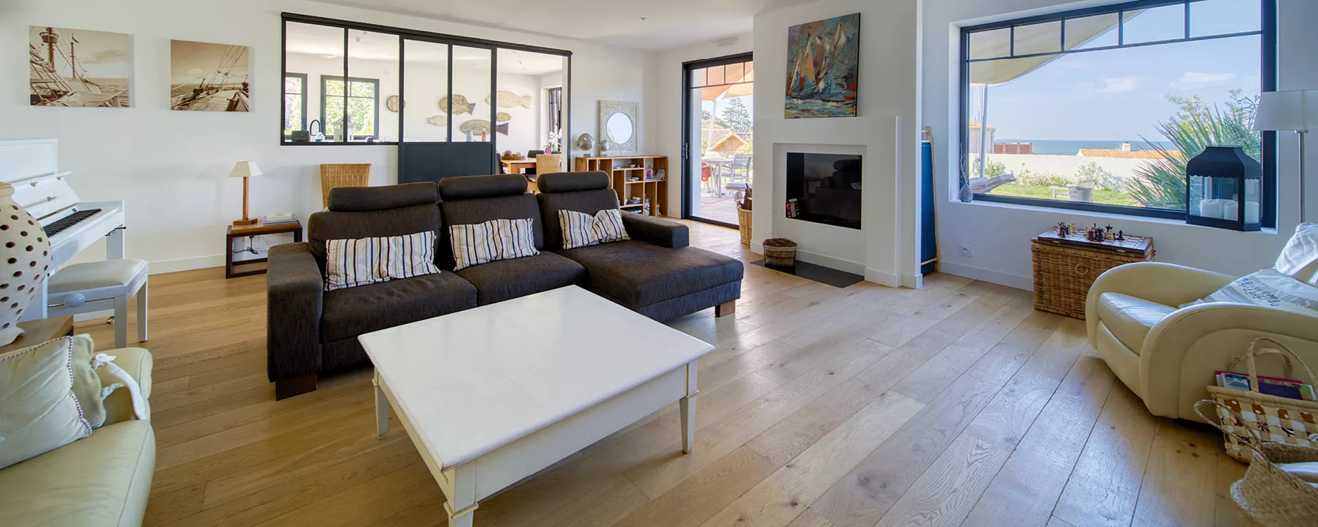 Dans le séjour, des petits bois réinterprètent les verrières façon atelier et apportent un cachet supplémentaire. Une large baie à galandage 1 rail 1 vantail disparaît derrière la cheminée et offre un accès total à la terrasse. Depuis son fauteuil-club, James profite de la plus belle vue grâce à un grand fixe de 3.2 x 1.5 mètres de large qui offre un tableau inégalable sur le paysage marin.