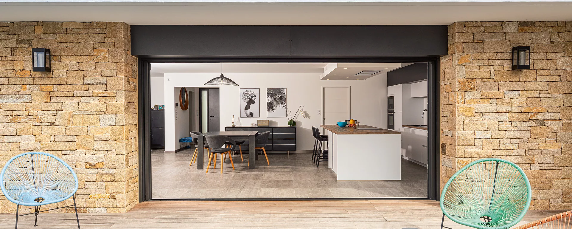 Leur pièce de vie est une ode à la liberté, avec de grandes baies à galandage dont les vantaux coulissent pour s'effacer complètement et libérer le passage. Une ouverture totale qui laisse l’extérieur s’inviter à l’intérieur, et inversement !